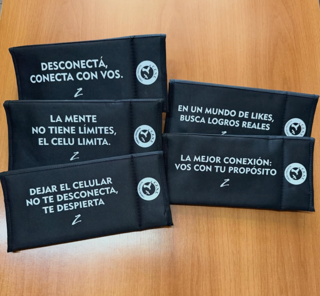 Se trata de estuches cerrados con broches especiales. Fueron diseñados para que cada estudiante guarde su celular al ingresar y solo pueda retirarlo al finalizar la jornada escolar. Los teléfonos permanecen guardados incluso durante los recreos, como parte del compromiso colectivo de “desenchufarse” para recuperar la atención, el juego y el vínculo directo entre compañeros.