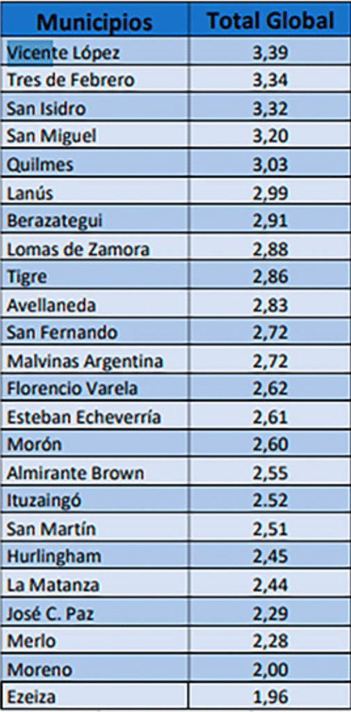 El primer puesto lo ocupa Vicente López, con una puntuación global de 3,39. El municipio norteño comparte el podio Tres de Febrero (3,34) y San Isidro (3,32).